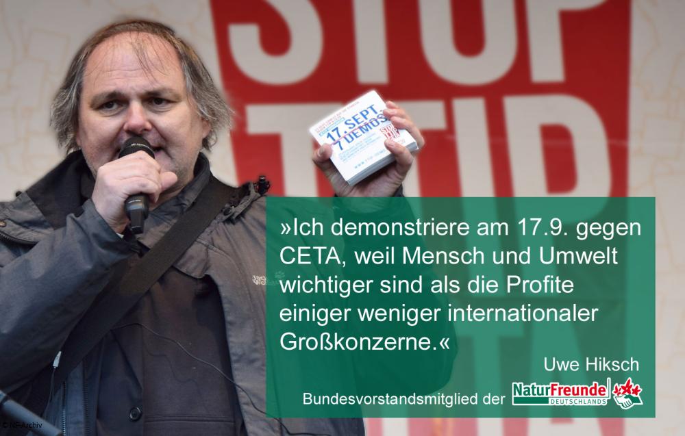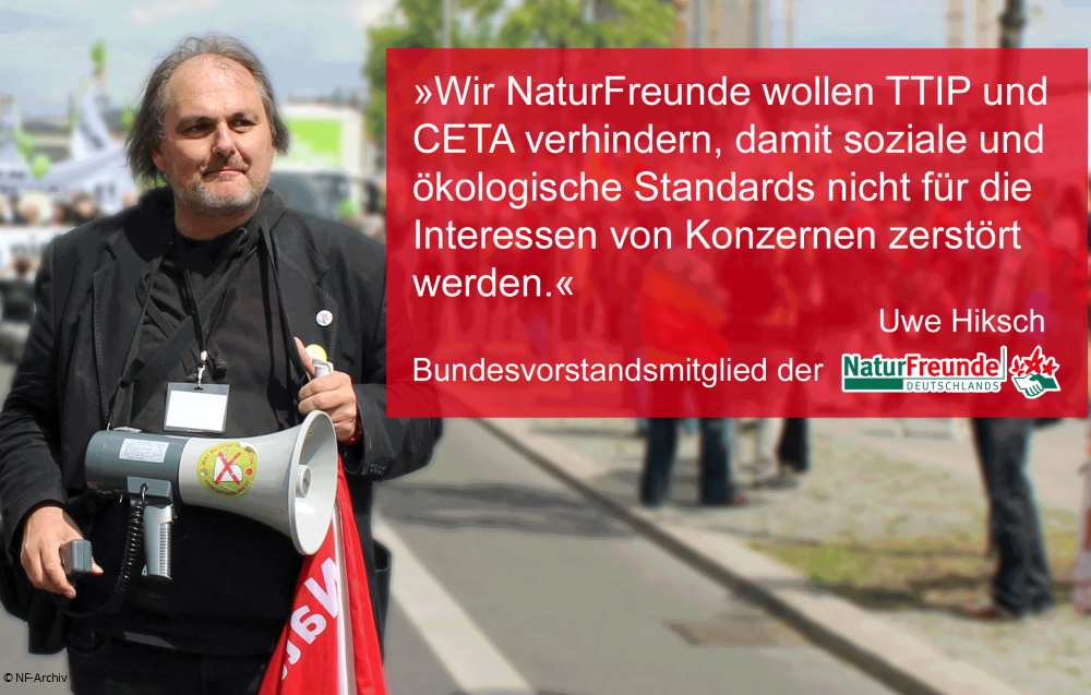 Uwe Hiksch, Mitglied im Bundesvorstand der NaturFreunde Deutschlands und im bundesweiten Arbeitsausschuss für die sieben Großdemonstrationen appelliert nochmals an die SPD: „Wir NaturFreunde fordern die sofortige Beendigung der Geheimverhandlungen für das Freihandelsabkommen TTIP und die Ablehnung des neoliberalen Freihandelsabkommens CETA. Zwei Tage vor dem SPD-Konvent in Wolfsburg appellieren wir noch einmal an alle Delegierten, CETA abzulehnen.“