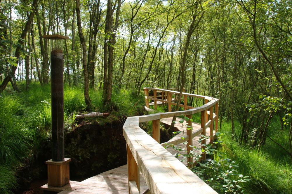 Allein für den 270 Meter langen Bohlenweg schleppten 24 Freiwillige drei Wochen lang jeweils einen Zentner schwere Eichenbohlen in das Moor. Nun führt der massive Weg mit Handlauf um den „Knust“ herum, den höchsten Teil des Moores, der in einem Schichtenmodell aufgelassen wurde. Die schwimmende Konstruktion schützt sowohl den morastigen Torfboden als auch den Holzweg. Auch der große Unterstand wurde massiv aus Holz gebaut und das Dach begrünt.