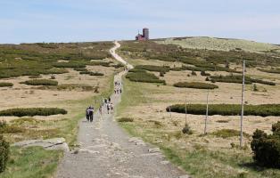 Eine Ausnahme bildet die Sněžka, die Schneekoppe: Steile Serpentinen führen auf den höchsten Gipfel des Riesengebirges, mit 1.602 Höhenmetern überragt er alles und bietet bei geeignetem Wetter einen fantastischen Rundblick. Weniger geübte Wanderer haben hier Gelegenheit, der Europäischen Union ein Loblied zu singen: Die Schneekoppe ist Grenzgebiet zwischen Polen und Tschechien, der steile Weg ist der auf tschechischer Seite. Die Polen aber betreiben auf der Schneekoppe eine meteorologische Station, ein Gebäude, das aussieht, als sei soeben ein UFO gelandet. Für die Versorgung der Station gibt es einen sanften, leicht ansteigenden Weg, der auch mit dem Fahrrad befahrbar ist.